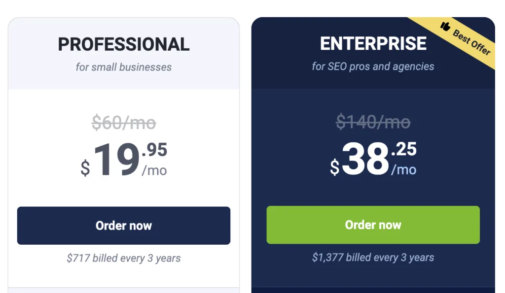 At Woblogger, we offer the best available SEO PowerSuite discount. Normally, the SEO PowerSuite Professional and Enterprise plans cost $716 and $1676 per year, respectively. But Woblogger users can claim up to 65% off when they sign up using our exclusive promo links.